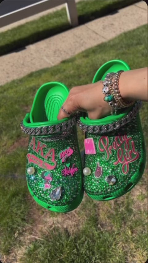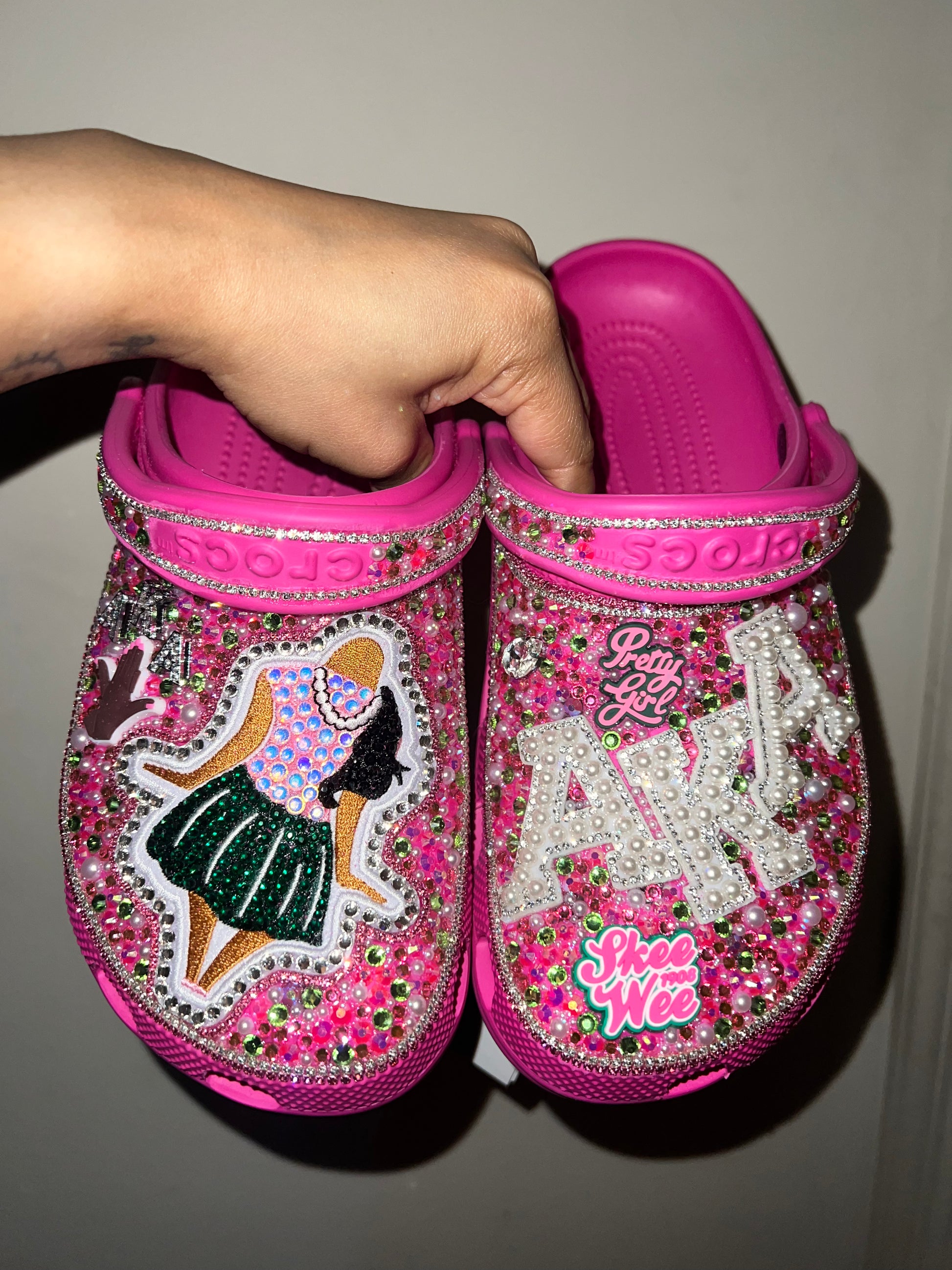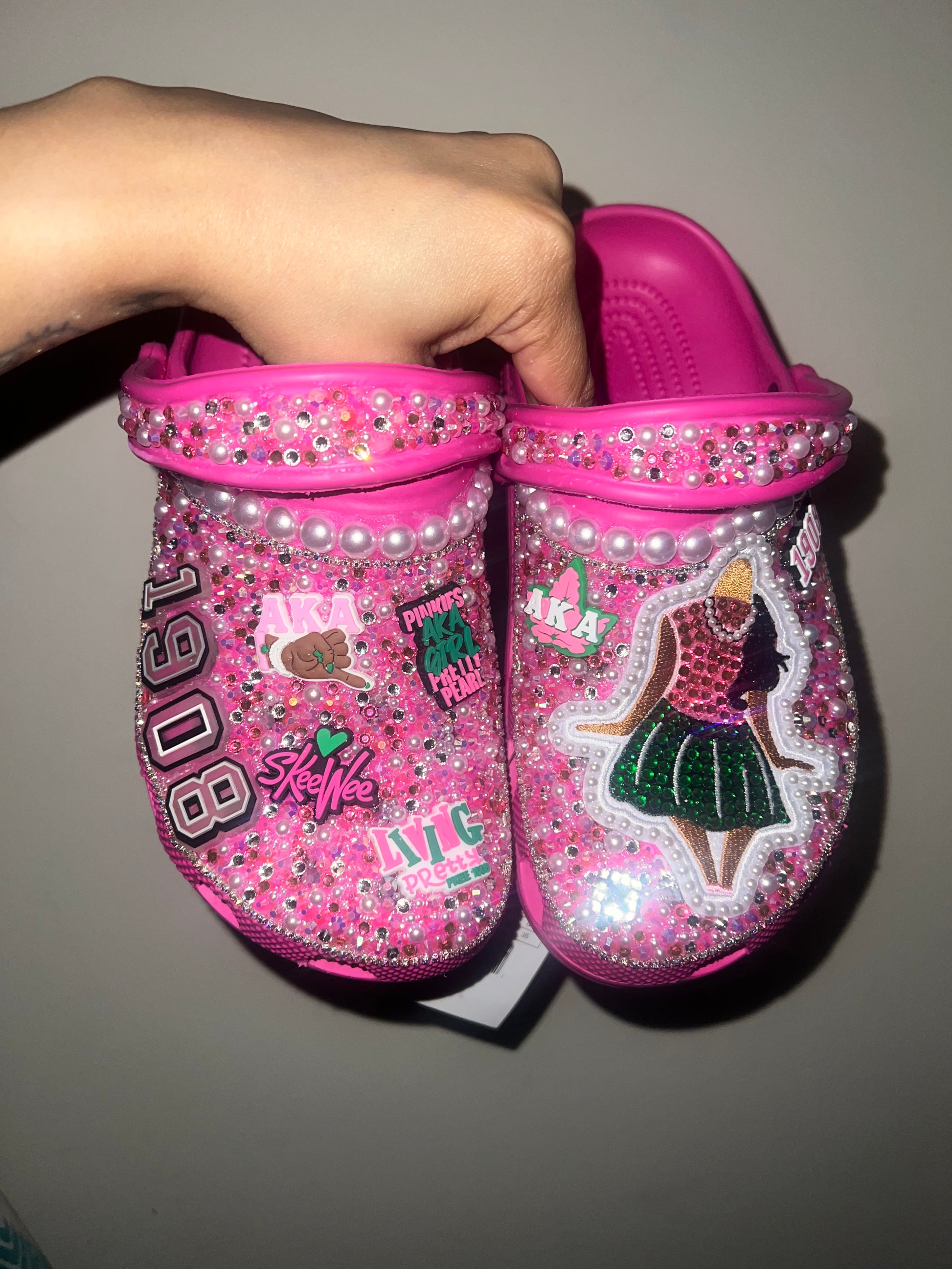 Introducing the AKA Bling Crocs, perfect for the fashion-forward sorority woman. These crocs feature a unique bling design that adds a touch of glamour to any outfit. With 100% comfort and style, elevate your sorority game with the AKA Bling Crocs.