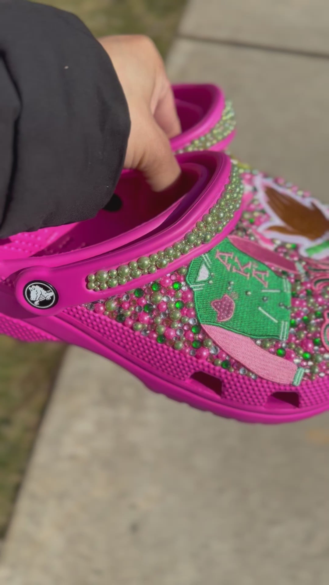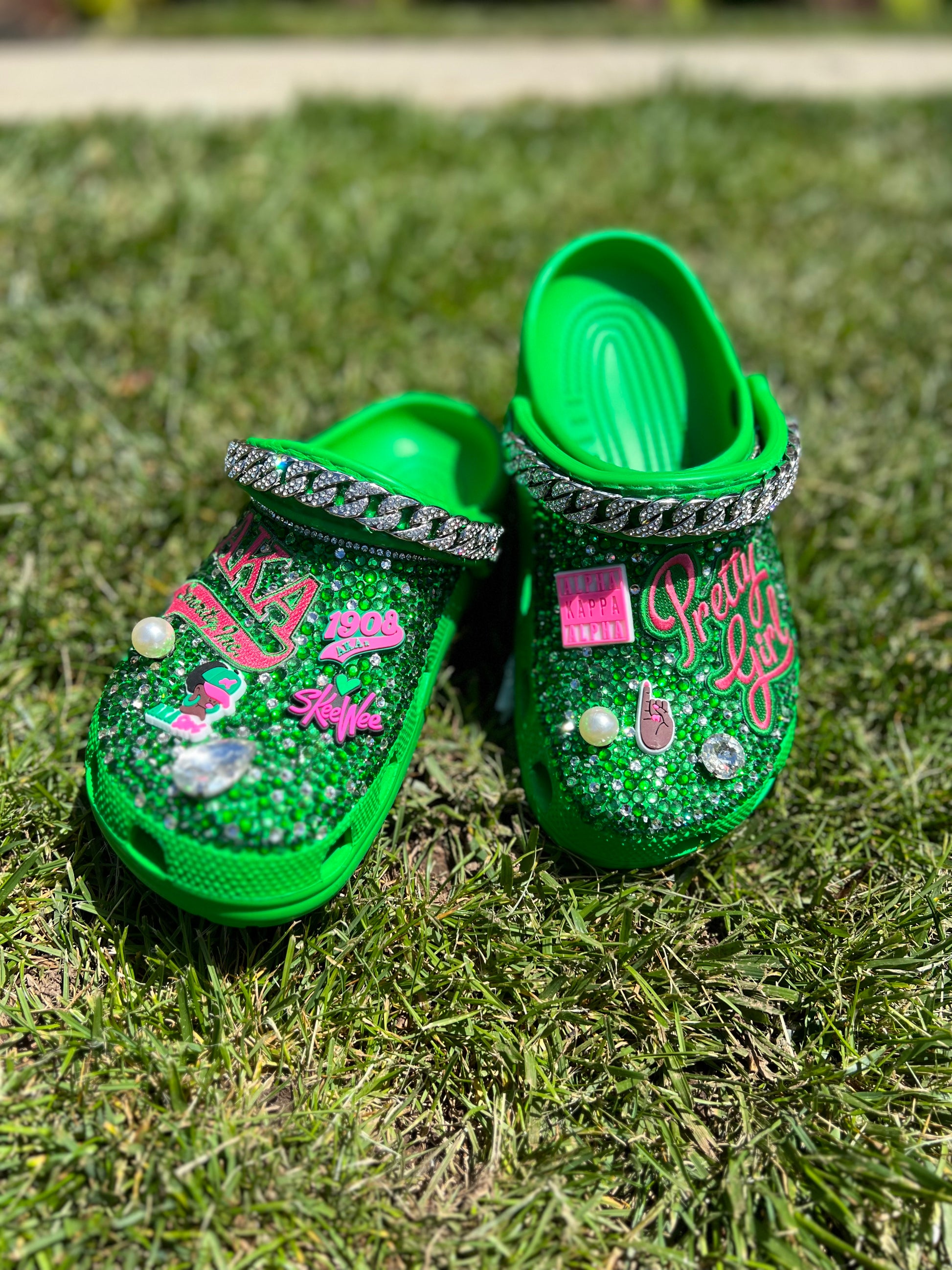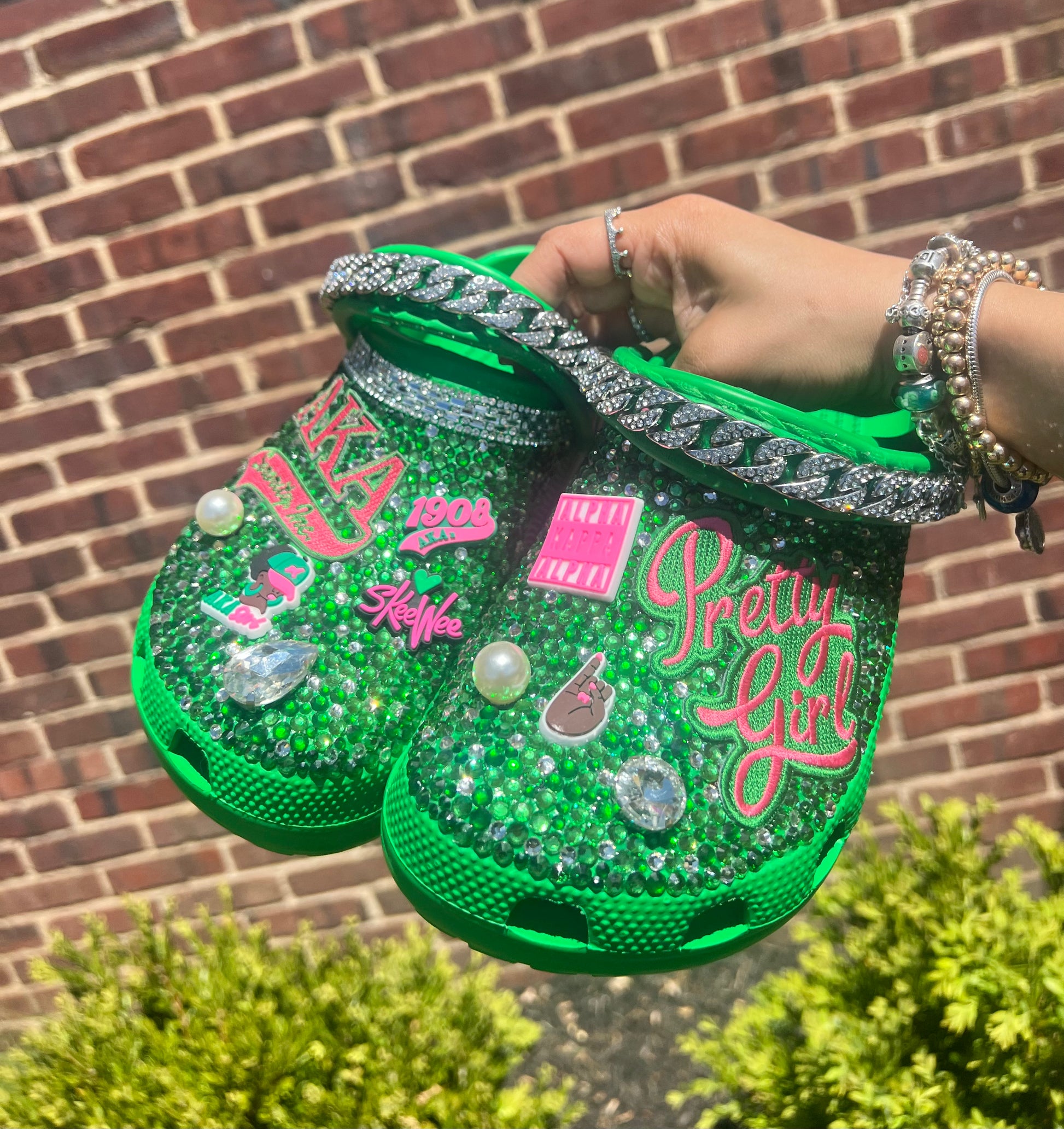 Introducing the AKA Bling Crocs, perfect for the fashion-forward sorority woman. These crocs feature a unique bling design that adds a touch of glamour to any outfit. With 100% comfort and style, elevate your sorority game with the AKA Bling Crocs.
